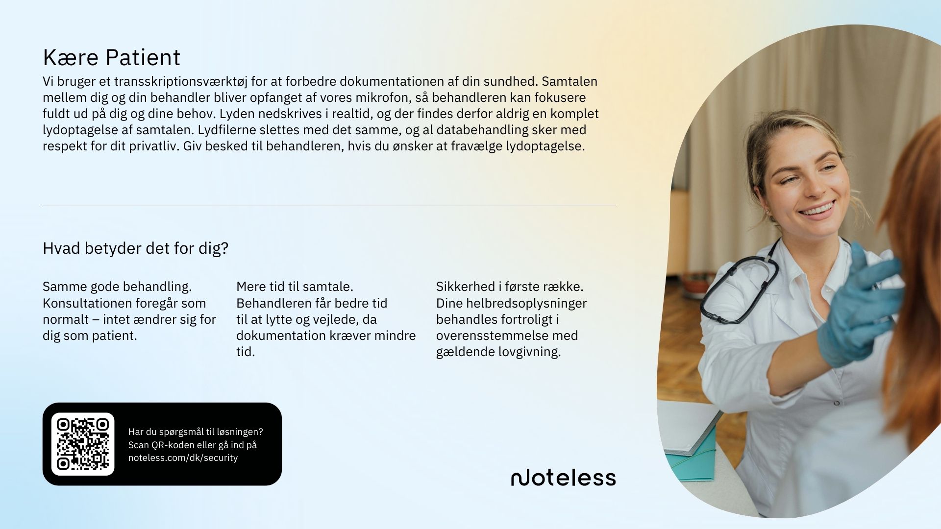Vi bruger et transskriptionsværktøj for at forbedre dokumentationen af din sundhed. Samtalen mellem dig og din behandler bliver opfanget af vores mikrofon, så behandleren kan fokusere fuldt ud på dig og dine behov. Lyden nedskrives i realtid, og der findes derfor aldrig en komplet lydoptagelse af samtalen. Lydfilerne slettes med det samme, og al databehandling sker med respekt for dit privatliv. Giv besked til behandleren, hvis du ønsker at fravælge lydoptagelse.